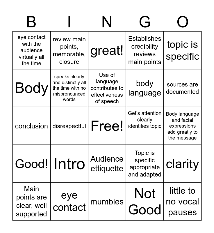 This bingo card has a free space and 24 words: Intro, eye contact, Use of language contributes to effectiveness of speech, Main points are clear, well supported, topic is specific, eye contact with the audience virtually all the time, Body, review main points, memorable, closure, Get's attention clearly identifies topic, Audience ettiquette, body language, conclusion, Topic is specific appropriate and adapted, clarity, speaks clearly and distinctly all the time with no mispronounced words, Not Good, Body language and facial expressions add greatly to the message, great!, sources are documented, disrespectful, little to no vocal pauses, Good!, Establishes credibility reviews main points and mumbles.