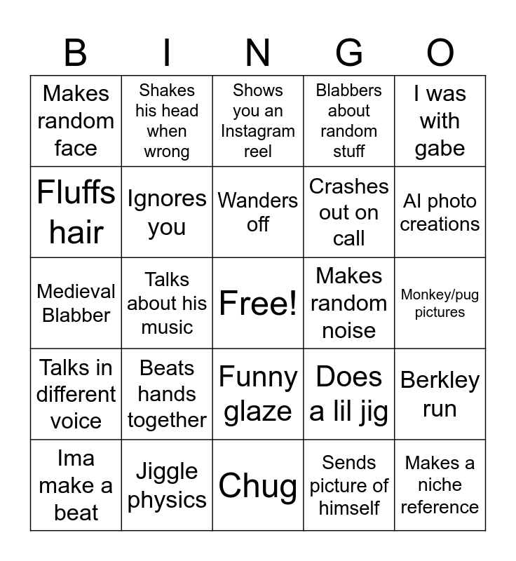 This bingo card has a free space and 24 words: Beats hands together, Jiggle physics, Wanders off, Ima make a beat, I was with gabe, Makes random face, Fluffs hair, Shakes his head when wrong, Makes random noise, Funny glaze, Crashes out on call, Medieval Blabber, Does a lil jig, Berkley run, Ignores you, Sends picture of himself, Monkey/pug pictures, Shows you an Instagram reel, AI photo creations, Talks about his music, Makes a niche reference, Talks in different voice, Blabbers about random stuff and Chug.