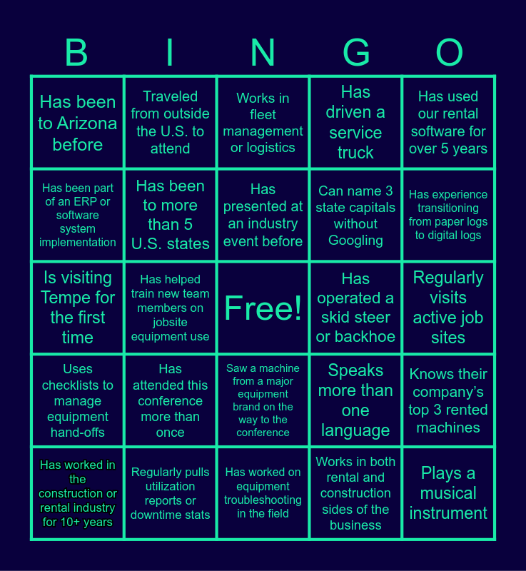 This bingo card has a free space and 24 words: Has worked in the construction or rental industry for 10+ years, Has attended this conference more than once, Has presented at an industry event before, Works in both rental and construction sides of the business, Has used our rental software for over 5 years, Has been to Arizona before, Traveled from outside the U.S. to attend, Works in fleet management or logistics, Has operated a skid steer or backhoe, Regularly visits active job sites, Is visiting Tempe for the first time, Has been to more than 5 U.S. states, Speaks more than one language, Knows their company’s top 3 rented machines, Has been part of an ERP or software system implementation, Regularly pulls utilization reports or downtime stats, Has worked on equipment troubleshooting in the field, Has driven a service truck, Has experience transitioning from paper logs to digital logs, Uses checklists to manage equipment hand-offs, Has helped train new team members on jobsite equipment use, Saw a machine from a major equipment brand on the way to the conference, Can name 3 state capitals without Googling and Plays a musical instrument.
