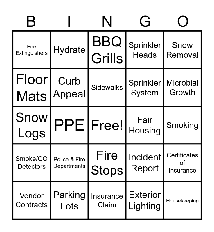 This bingo card has a free space and 26 words: Fire Stops, Exterior Lighting, Sidewalks, Parking Lots, Snow Removal, Fire Extinguishers, Floor Mats, Hydrate, Smoking, Incident Report, Sprinkler System, Snow Logs, Certificates of Insurance, Vendor Contracts, PPE, First Aid Kits, Sprinkler Heads, Smoke/CO Detectors, BBQ Grills, Housekeeping, Microbial Growth, Insurance Claim, Fair Housing, Police & Fire Departments, Curb Appeal and Physical Inspections.