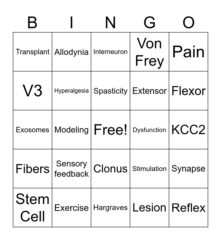 This bingo card has a free space and 75 words: Shox2, Whole Cell Patch Clamp, Interneuron, Electro-physiology, Rhythmic, Dopamine, Serotonin, Motor Neuron, Spinal Cord Injury, Inhibition, Regeneration, Rehabilitation, Spasticity, V3, Hyperreflexia, Modeling, Locomotion, Reflex, Proprioception, Pain, Macrophages, Exosomes, Hyperalgesia, Allodynia, Von Frey, GABA, Mice, Muscle, Afferents, Excitability, Robot, Graft, Training, Stimulation, Flexor, Extensor, Sparing, Axon, KCC2, Lesion, Sprouting, Presynaptic, Immunohisto-chemistry, Turning, Spindles, Respiration, Stem Cell, Transplant, Tracing, Inflammation, Descending, Clonus, Autonomic, Microglia, Reaching, Chloride, Receptor, Cutaneous, Nociceptor, Central Pattern Generator (CPG), Sensory feedback, Ror-Beta, Excitation, AAV, Simulation, Dysfunction, Step cycle, Membrane, Rats, Synapse, Fibers, Exercise, Diaphragm, Hargraves and Neuron.