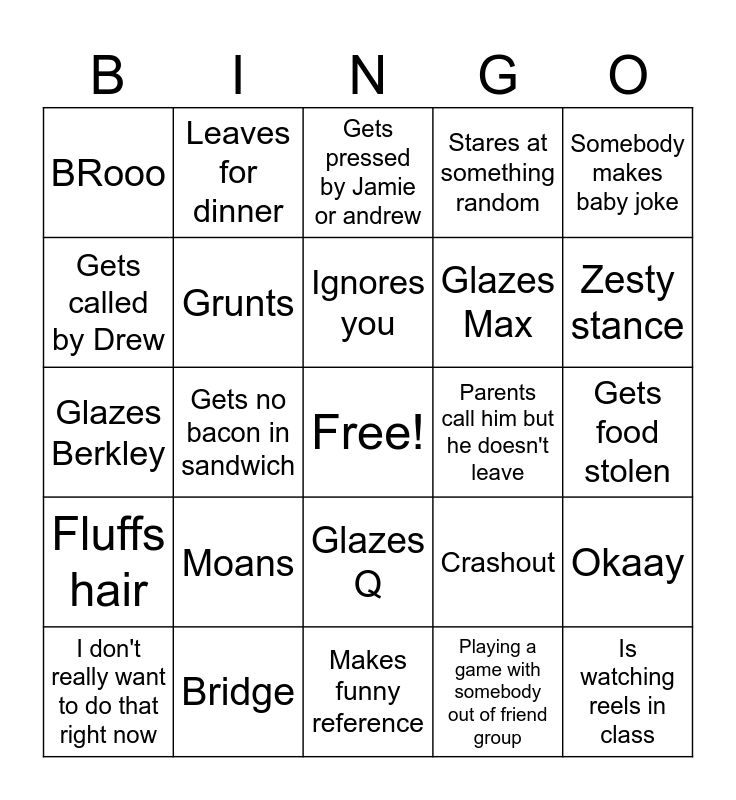 This bingo card has a free space and 24 words: Moans, Bridge, Ignores you, I don't really want to do that right now, Somebody makes baby joke, BRooo, Gets called by Drew, Leaves for dinner, Parents call him but he doesn't leave, Glazes Q, Glazes Max, Glazes Berkley, Crashout, Okaay, Grunts, Playing a game with somebody out of friend group, Gets food stolen, Gets pressed by Jamie or andrew, Zesty stance, Gets no bacon in sandwich, Is watching reels in class, Fluffs hair, Stares at something random and Makes funny reference.