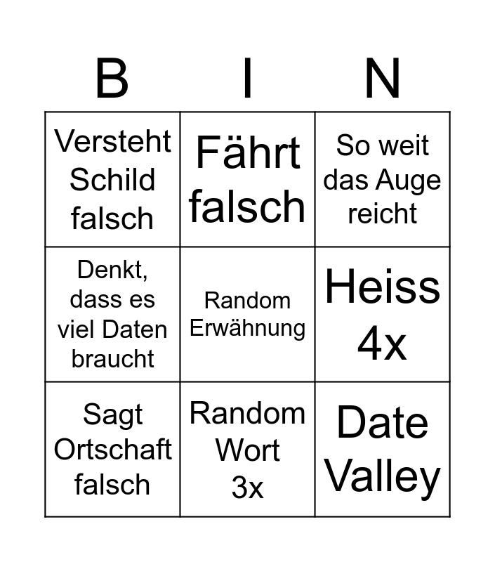 This bingo card has a free space and 8 words: Heiss 4x, So weit das Auge reicht, Fährt falsch, Sagt Ortschaft falsch, Versteht Schild falsch, Date Valley, Denkt, dass es viel Daten braucht and Random Wort 3x.