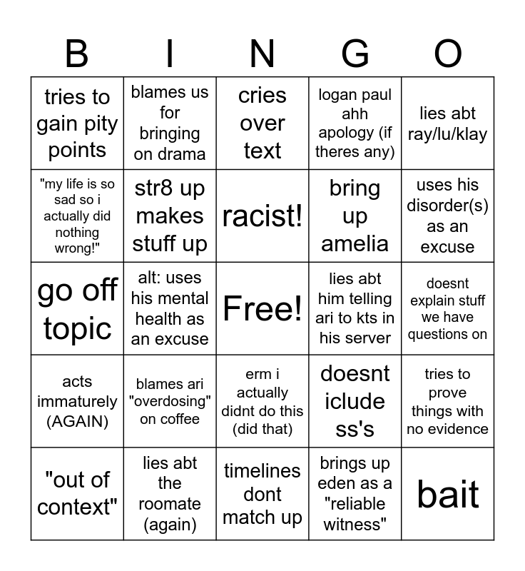 This bingo card has a free space and 24 words: blames ari "overdosing" on coffee, lies abt the roomate (again), racist!, "out of context", lies abt ray/lu/klay, tries to gain pity points, "my life is so sad so i actually did nothing wrong!", blames us for bringing on drama, lies abt him telling ari to kts in his server, erm i actually didnt do this (did that), bring up amelia, go off topic, doesnt iclude ss's, tries to prove things with no evidence, str8 up makes stuff up, brings up eden as a "reliable witness", doesnt explain stuff we have questions on, cries over text, uses his disorder(s) as an excuse, alt: uses his mental health as an excuse, bait, acts immaturely (AGAIN), logan paul ahh apology (if theres any) and timelines dont match up.