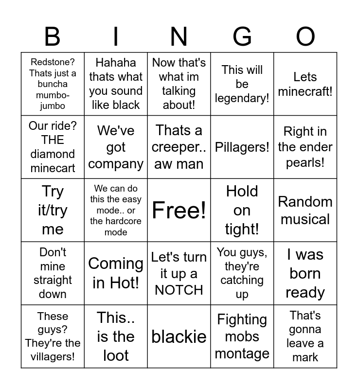 This bingo card has a free space and 24 words: Coming in Hot!, This.. is the loot, Thats a creeper.. aw man, These guys? They're the villagers!, Lets minecraft!, Redstone? Thats just a buncha mumbo-jumbo, Our ride? THE diamond minecart, Hahaha thats what you sound like black, Hold on tight!, Let's turn it up a NOTCH, Pillagers!, Try it/try me, You guys, they're catching up, I was born ready, We've got company, Fighting mobs montage, Random musical, Now that's what im talking about!, Right in the ender pearls!, We can do this the easy mode.. or the hardcore mode, That's gonna leave a mark, Don't mine straight down, This will be legendary! and blackie.