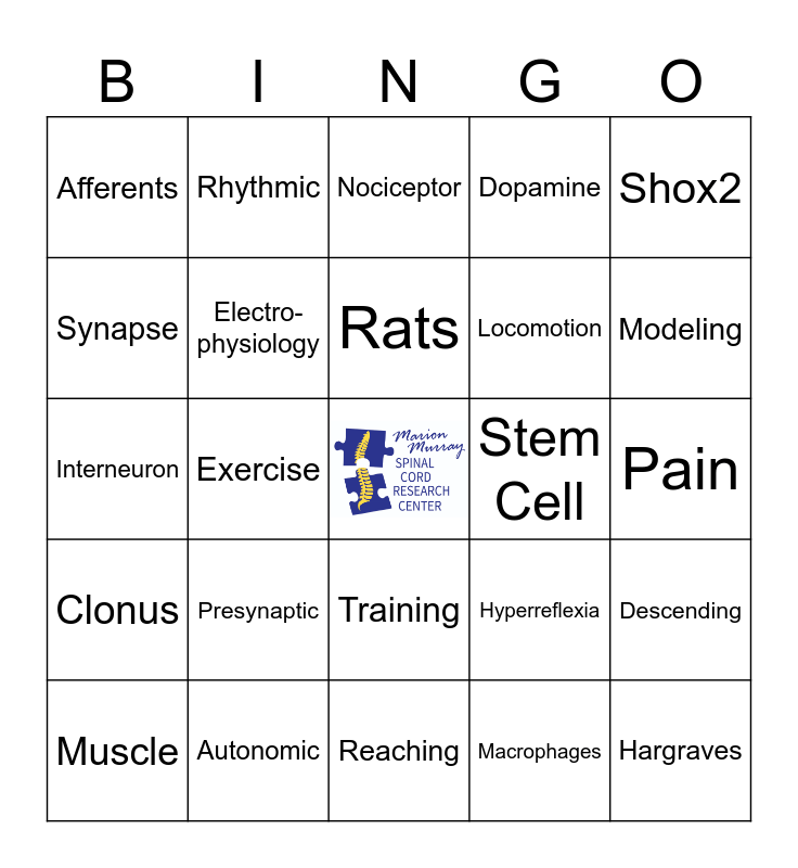 This bingo card has a free space and 75 words: Receptor, Cutaneous, Nociceptor, Central Pattern Generator (CPG), Sensory feedback, Ror-Beta, Excitation, AAV, Simulation, Dysfunction, Step cycle, Membrane, Rats, Synapse, Fibers, Exercise, Diaphragm, Hargraves, Neuron, Shox2, Whole Cell Patch Clamp, Interneuron, Electro-physiology, Rhythmic, Dopamine, Serotonin, Motor Neuron, Spinal Cord Injury, Inhibition, Regeneration, Rehabilitation, Spasticity, V3, Hyperreflexia, Modeling, Locomotion, Reflex, Proprioception, Pain, Macrophages, Exosomes, Hyperalgesia, Allodynia, Von Frey, GABA, Mice, Muscle, Afferents, Excitability, Robot, Graft, Training, Stimulation, Flexor, Extensor, Sparing, Axon, KCC2, Lesion, Sprouting, Presynaptic, Immunohisto-chemistry, Turning, Spindles, Respiration, Stem Cell, Transplant, Tracing, Inflammation, Descending, Clonus, Autonomic, Microglia, Reaching and Chloride.