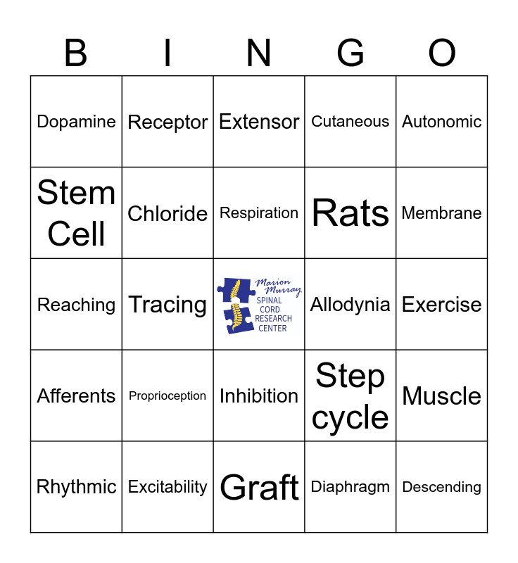 This bingo card has a free space and 75 words: Stimulation, Flexor, Extensor, Sparing, Axon, KCC2, Lesion, Sprouting, Presynaptic, Immunohisto-chemistry, Turning, Spindles, Respiration, Stem Cell, Transplant, Tracing, Inflammation, Descending, Clonus, Autonomic, Microglia, Reaching, Chloride, Receptor, Cutaneous, Nociceptor, Central Pattern Generator (CPG), Sensory feedback, Ror-Beta, Excitation, AAV, Simulation, Dysfunction, Step cycle, Membrane, Rats, Synapse, Fibers, Exercise, Diaphragm, Hargraves, Neuron, Shox2, Whole Cell Patch Clamp, Interneuron, Electro-physiology, Rhythmic, Dopamine, Serotonin, Motor Neuron, Spinal Cord Injury, Inhibition, Regeneration, Rehabilitation, Spasticity, V3, Hyperreflexia, Modeling, Locomotion, Reflex, Proprioception, Pain, Macrophages, Exosomes, Hyperalgesia, Allodynia, Von Frey, GABA, Mice, Muscle, Afferents, Excitability, Robot, Graft and Training.