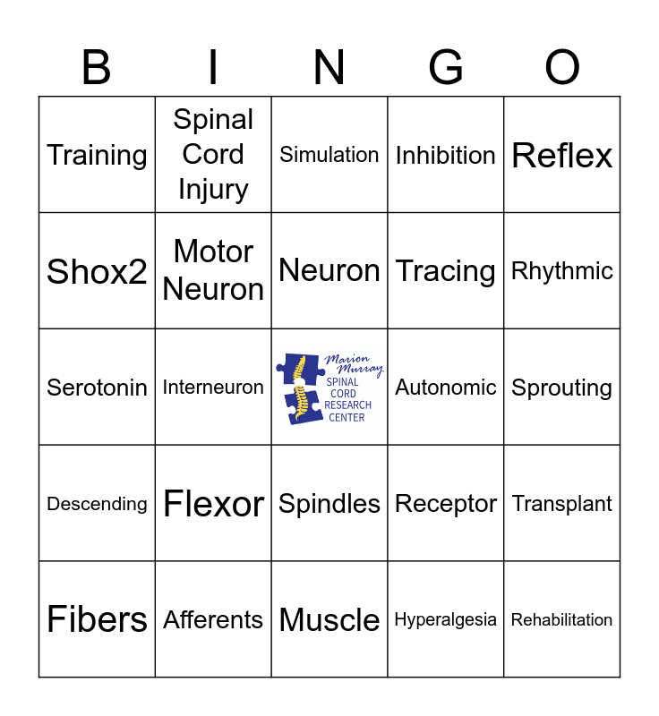 This bingo card has a free space and 74 words: Excitation, AAV, Simulation, Dysfunction, Step cycle, Membrane, Rats, Synapse, Fibers, Exercise, Diaphragm, Hargraves, Neuron, Shox2, Whole Cell Patch Clamp, Interneuron, Electro-physiology, Rhythmic, Dopamine, Serotonin, Motor Neuron, Spinal Cord Injury, Inhibition, Regeneration, Rehabilitation, Spasticity, V3, Hyperreflexia, Modeling, Locomotion, Reflex, Proprioception, Pain, Macrophages, Exosomes, Hyperalgesia, Allodynia, Von Frey, GABA, Mice, Muscle, Afferents, Excitability, Robot, Graft, Training, Stimulation, Flexor, Extensor Sparing, Axon, KCC2, Lesion, Sprouting, Presynaptic, Immunohisto-chemistry, Turning, Spindles, Respiration, Stem Cell, Transplant, Tracing, Inflammation, Descending, Clonus, Autonomic, Microglia, Reaching, Chloride, Receptor, Cutaneous, Nociceptor, Central Pattern Generator (CPG), Sensory feedback and Ror-Beta.