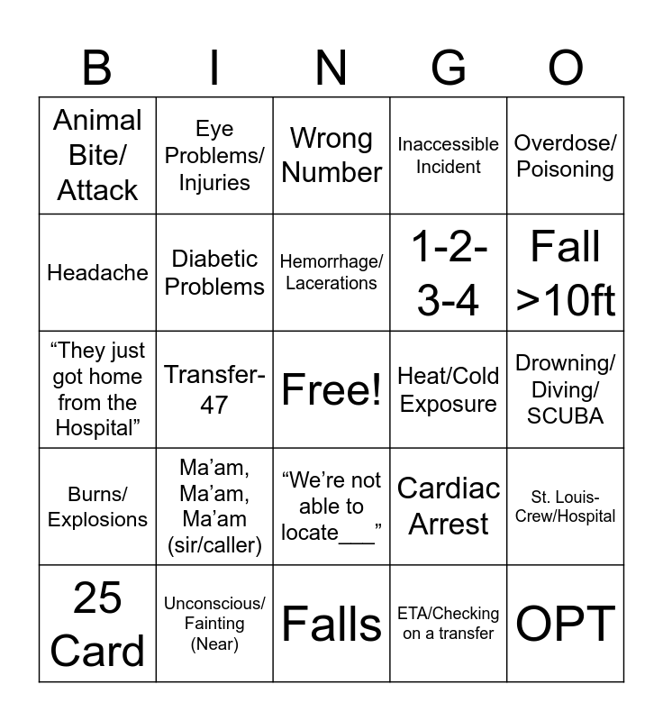 This bingo card has a free space and 73 words: Abdominal Pain, Allergic Reaction, Animal Bite/ Attack, Assault, Back Pain, Breathing Problems, Burns/ Explosions, Carbon Monoxide/ HAZMAT/ CBRN, Cardiac Arrest, Chest Pain, Choking, Convulsions/Seizures, Diabetic Problems, Drowning/ Diving/ SCUBA, Electrocution/ Lightning, Eye Problems/ Injuries, Falls, Headache, Heart Problems/ AICD, Heat/Cold Exposure, Hemorrhage/ Lacerations, Inaccessible Incident, Overdose/ Poisoning, Pregnancy, 25 Card, Sick Person, Stabbing, Stroke, MVA, Traumatic Injuries, Unconscious/ Fainting (Near), Unknown Problems/ Man Down, Transfer-45, Transfer-46, Transfer-47, GSW, Flight, MCI, OPT, TCD, ETA/Checking on a transfer, Ma’am, Ma’am, Ma’am (sir/caller), “I’m not with them...”, Tech Problem, “Just get here!”/ “Hurry Up!”, 1-2-3-4, Wrong Number, “We’ll take that call”/ “Put that on our CAD”, “There’s a Doctor/Nurse with them” (not at a facility), “They just got home from the Hospital”, “We need a bird”/ “Get us an aircraft”, AVE (not avenue, Tactical, Fire Standby, Not in Mercy response area, DOA, Mutual Aid Request, “We’re not able to locate___”, Possibly unconscious, haven’t checked on them, Narcan, “We request an interior/exterior check”, “&%$@*#”, Unknown further, Fall >10ft, Sinking vehicle, Supervisor, Stage, “It’s not an emergency”, St. Louis-Crew/Hospital, PCS form (needed/sent), Airport Transfer, Perry Co and Blind Transfer.