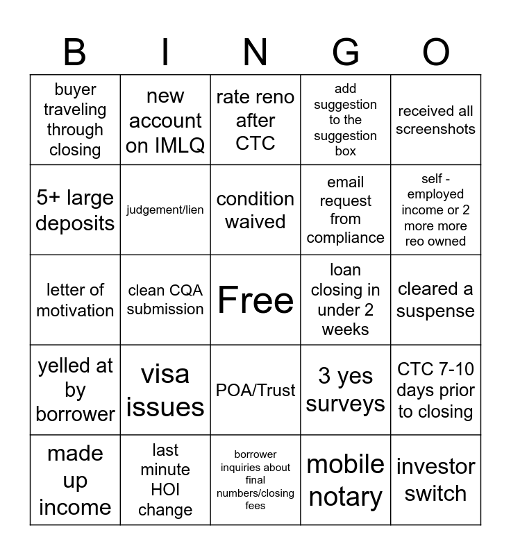 This bingo card has a free space and 24 words: visa issues, last minute HOI change, condition waived, made up income, received all screenshots, buyer traveling through closing, 5+ large deposits, new account on IMLQ, loan closing in under 2 weeks, POA/Trust, email request from compliance, letter of motivation, 3 yes surveys, CTC 7-10 days prior to closing, judgement/lien, mobile notary, cleared a suspense, rate reno after CTC, self - employed income or 2 more more reo owned, clean CQA submission, investor switch, yelled at by borrower, add suggestion to the suggestion box and borrower inquiries about final numbers/closing fees.