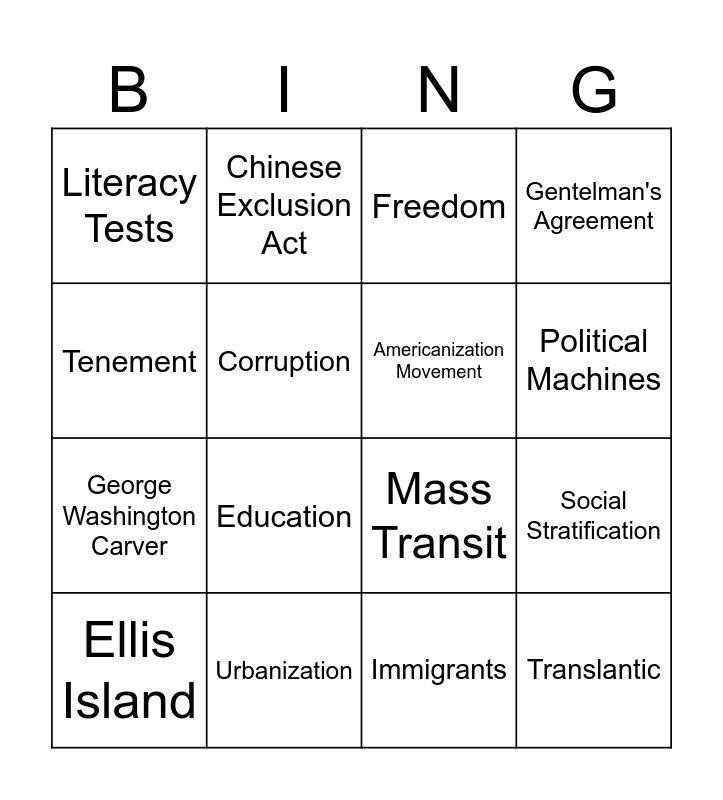 This bingo card has 16 words: Urbanization, Social Stratification, Freedom, Literacy Tests, George Washington Carver, Chinese Exclusion Act, Mass Transit, Immigrants, Tenement, Corruption, Ellis Island, Gentelman's Agreement, Education, Political Machines, Americanization Movement and Translantic.