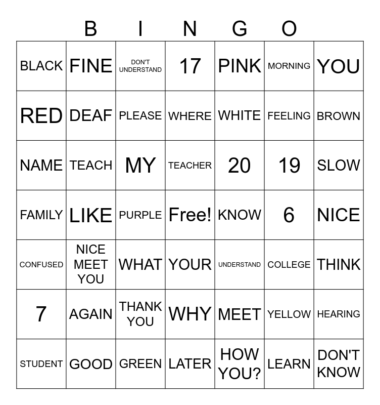 This bingo card has a free space and 48 words: MEET, FEELING, LATER, LIKE, MY, NICE, FINE, GOOD, MORNING, YOUR, YOU, 17, 19, 20, 7, 6, RED, BROWN, YELLOW, PINK, WHITE, PURPLE, BLACK, DEAF, HEARING, PLEASE, SLOW, STUDENT, TEACHER, TEACH, LEARN, KNOW, THINK, AGAIN, FAMILY, UNDERSTAND, COLLEGE, NAME, WHAT, THANK YOU, CONFUSED, DON'T KNOW, DON'T UNDERSTAND, GREEN, WHERE, WHY, NICE MEET YOU and HOW YOU?.