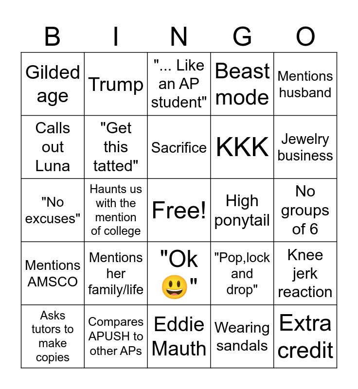 This bingo card has a free space and 34 words: Shirtless Justin Bieber, Wearing sandals, No freeloading, AVID hoodie, Mentions AMSCO, "Get this tatted", Mentions husband, Asks tutors to make copies, Trump, Talks about her class, Sacrifice, "... Like an AP student", "College bound", Disses us, High ponytail, Jewelry business, Compares APUSH to other APs, "No excuses", Mentions her family/life, "Pop,lock and drop", "Ok😃", "Lock in", Gilded age, No groups of 6, Eddie Mauth, Extra credit, Beast mode, "What's this person missing?", KKK, Calls out Luna, Uses Sadia for doc title, Haunts us with the mention of college, Knee jerk reaction and Farewell address.