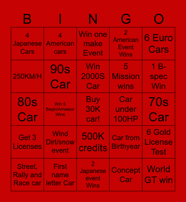 This bingo card has a free space and 24 words: Street, Rally and Race car, Wind Dirt/snow event, Win 2000S Car, Concept Car, 6 Euro Cars, 4 Japanese Cars, 4 American cars, Win one make Event, Car under 100HP, 70s Car, 80s Car, 90s Car, Car from Birthyear, 6 Gold License Test, 250KM/H, First name letter Car, 2 Japanese event Wins, 2 American Event Wins, 1 B-spec Win, Get 3 Licenses, Win 5 Begin/Amateur Wins, 500K credits, 5 Mission wins and World GT win.