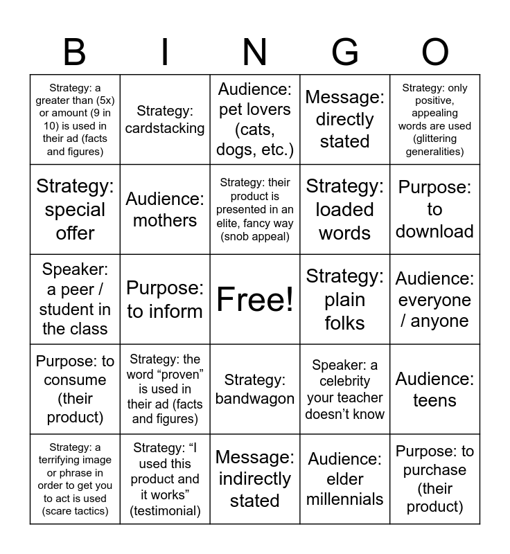 This bingo card has a free space and 24 words: Strategy: the word “proven” is used in their ad (facts and figures), Strategy: “I used this product and it works” (testimonial), Strategy: their product is presented in an elite, fancy way (snob appeal), Strategy: a terrifying image or phrase in order to get you to act is used (scare tactics), Strategy: only positive, appealing words are used (glittering generalities), Strategy: a greater than (5x) or amount (9 in 10) is used in their ad (facts and figures), Strategy: special offer, Strategy: cardstacking, Strategy: plain folks, Strategy: bandwagon, Strategy: loaded words, Speaker: a peer / student in the class, Speaker: a celebrity your teacher doesn’t know, Audience: teens, Audience: mothers, Audience: elder millennials, Audience: everyone / anyone, Audience: pet lovers (cats, dogs, etc.), Purpose: to download, Purpose: to inform, Purpose: to purchase (their product), Purpose: to consume (their product), Message: directly stated and Message: indirectly stated.