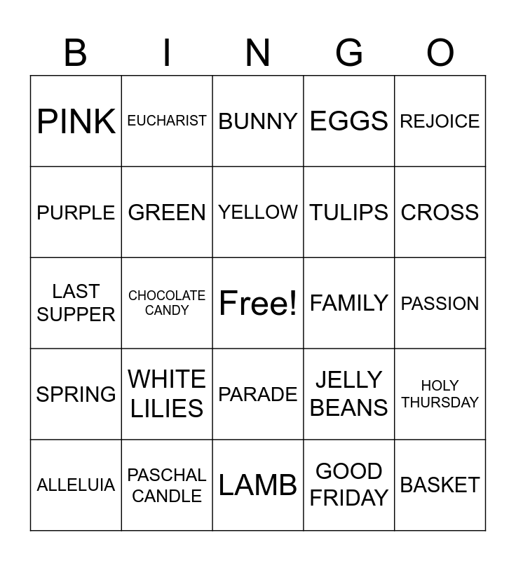 This bingo card has a free space and 29 words: ALLELUIA, BUTTERFLIES, CHOCOLATE CANDY, MASS, PINK, BUNNY, GREEN, WHITE LILIES, FAMILY, PASCHAL CANDLE, PASSION, BASKET, LAMB, GOOD FRIDAY, CROSS, PALMS, PARADE, SPRING, REJOICE, LAST SUPPER, JELLY BEANS, RESURRECTION, TULIPS, PURPLE, EGGS, EUCHARIST, HOLY THURSDAY, YELLOW and CHICKS.