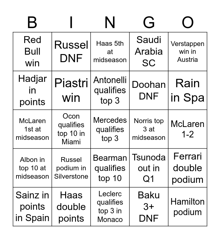 This bingo card has a free space and 24 words: Russel podium in Silverstone, Haas double points, Antonelli qualifies top 3, Sainz in points in Spain, Verstappen win in Austria, Red Bull win, Hadjar in points, Russel DNF, Norris top 3 at midseason, Bearman qualifies top 10, Doohan DNF, McLaren 1st at midseason, Tsunoda out in Q1, Ferrari double podium, Piastri win, Baku 3+ DNF, McLaren 1-2, Haas 5th at midseason, Rain in Spa, Ocon qualifies top 10 in Miami, Hamilton podium, Albon in top 10 at midseason, Saudi Arabia SC and Leclerc qualifies top 3 in Monaco.