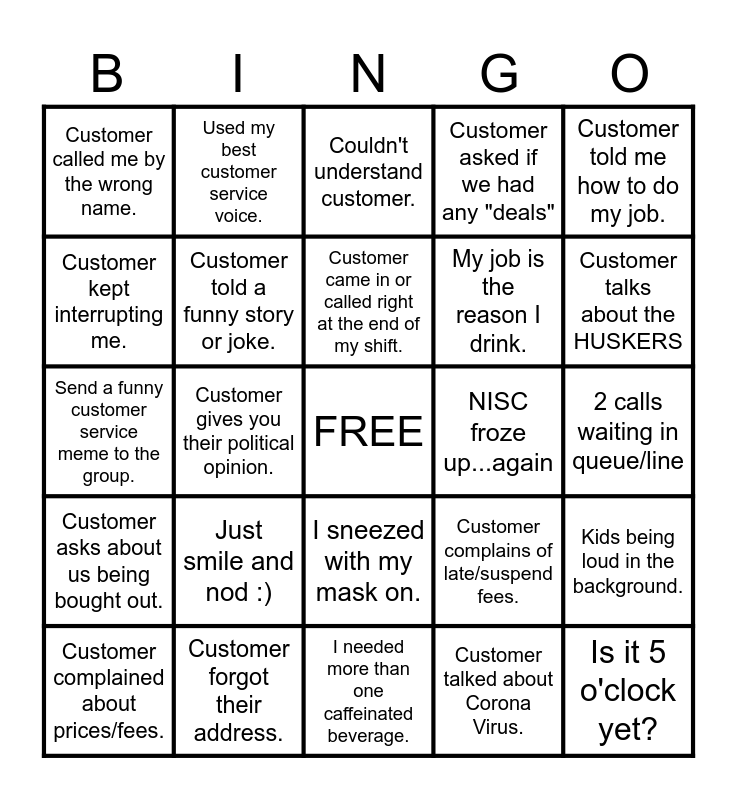 This bingo card has a free space and 24 words: Customer complained about prices/fees., Just smile and nod :), Customer came in or called right at the end of my shift., Customer talked about Corona Virus., Customer told me how to do my job., Customer called me by the wrong name., Used my best customer service voice., Couldn't understand customer., NISC froze up...again, 2 calls waiting in queue/line, Send a funny customer service meme to the group., Customer told a funny story or joke., Customer complains of late/suspend fees., Kids being loud in the background., Customer kept interrupting me., Customer forgot their address., I needed more than one caffeinated beverage., Customer asked if we had any "deals", Customer talks about the HUSKERS, Customer asks about us being bought out., Customer gives you their political opinion., I sneezed with my mask on., My job is the reason I drink. and Is it 5 o'clock yet?.