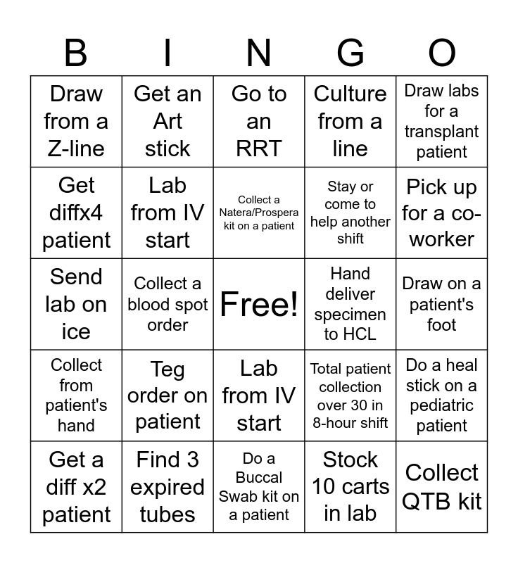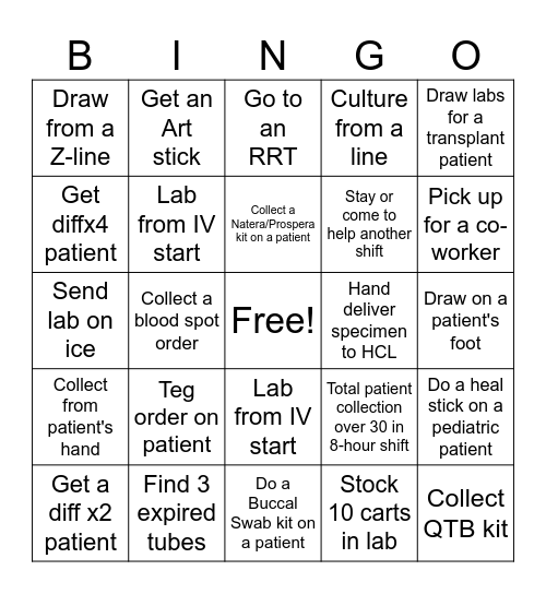 This bingo card has a free space and 24 words: Teg order on patient, Find 3 expired tubes, Collect a Natera/Prospera kit on a patient, Get a diff x2 patient, Draw labs for a transplant patient, Draw from a Z-line, Get diffx4 patient, Get an Art stick, Hand deliver specimen to HCL, Lab from IV start, Stay or come to help another shift, Send lab on ice, Total patient collection over 30 in 8-hour shift, Do a heal stick on a pediatric patient, Lab from IV start, Stock 10 carts in lab, Draw on a patient's foot, Go to an RRT, Pick up for a co-worker, Collect a blood spot order, Collect QTB kit, Collect from patient's hand, Culture from a line and Do a Buccal Swab kit on a patient.