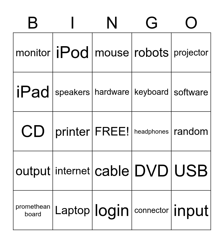 This bingo card has a free space and 24 words: internet, Laptop, hardware, promethean board, projector, monitor, iPad, iPod, headphones, cable, keyboard, CD, DVD, USB, speakers, connector, random, mouse, software, printer, input, output, robots and login.