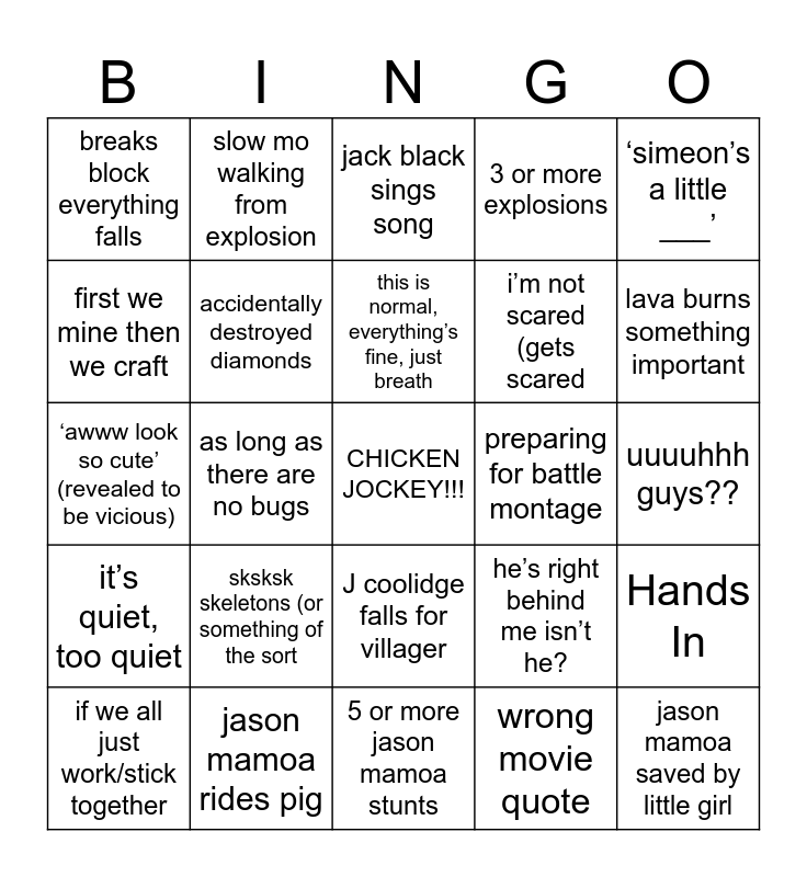 This bingo card has a free space and 24 words: sksksk skeletons (or something of the sort, jason mamoa rides pig, this is normal, everything’s fine, just breath, if we all just work/stick together, ‘simeon’s a little ___’, breaks block everything falls, first we mine then we craft, slow mo walking from explosion, preparing for battle montage, J coolidge falls for villager, i’m not scared (gets scared, ‘awww look so cute’ (revealed to be vicious), he’s right behind me isn’t he?, Hands In, accidentally destroyed diamonds, wrong movie quote, uuuuhhh guys??, jack black sings song, lava burns something important, as long as there are no bugs, jason mamoa saved by little girl, it’s quiet, too quiet, 3 or more explosions and 5 or more jason mamoa stunts.