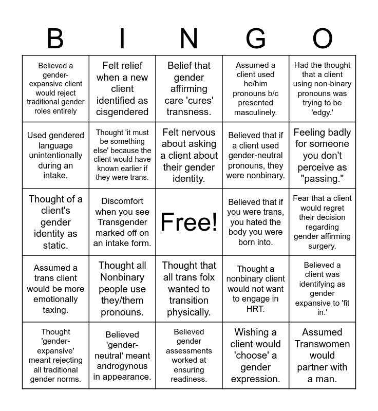 This bingo card has a free space and 24 words: Thought all Nonbinary people use they/them pronouns., Believed 'gender-neutral' meant androgynous in appearance., Felt nervous about asking a client about their gender identity., Thought 'gender-expansive' meant rejecting all traditional gender norms., Had the thought that a client using non-binary pronouns was trying to be 'edgy.', Believed a gender-expansive client would reject traditional gender roles entirely, Used gendered language unintentionally during an intake., Felt relief when a new client identified as cisgendered, Believed that if you were trans, you hated the body you were born into., Thought that all trans folx wanted to transition physically., Believed that if a client used gender-neutral pronouns, they were nonbinary., Thought of a client's gender identity as static., Thought a nonbinary client would not want to engage in HRT., Believed a client was identifying as gender expansive to 'fit in.', Thought 'it must be something else' because the client would have known earlier if they were trans., Wishing a client would 'choose' a gender expression., Fear that a client would regret their decision regarding gender affirming surgery., Belief that gender affirming care 'cures' transness., Feeling badly for someone you don't perceive as "passing.", Discomfort when you see Transgender marked off on an intake form., Assumed Transwomen would partner with a man., Assumed a trans client would be more emotionally taxing., Assumed a client used he/him pronouns b/c presented masculinely. and Believed gender assessments worked at ensuring readiness..