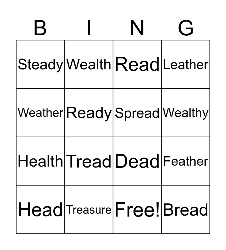 This bingo card has a free space and 15 words: Head, Bread, Read, Steady, Wealthy, Weather, Tread, Free!, Ready, Health, Feather, Leather, Spread, Wealth and Treasure.