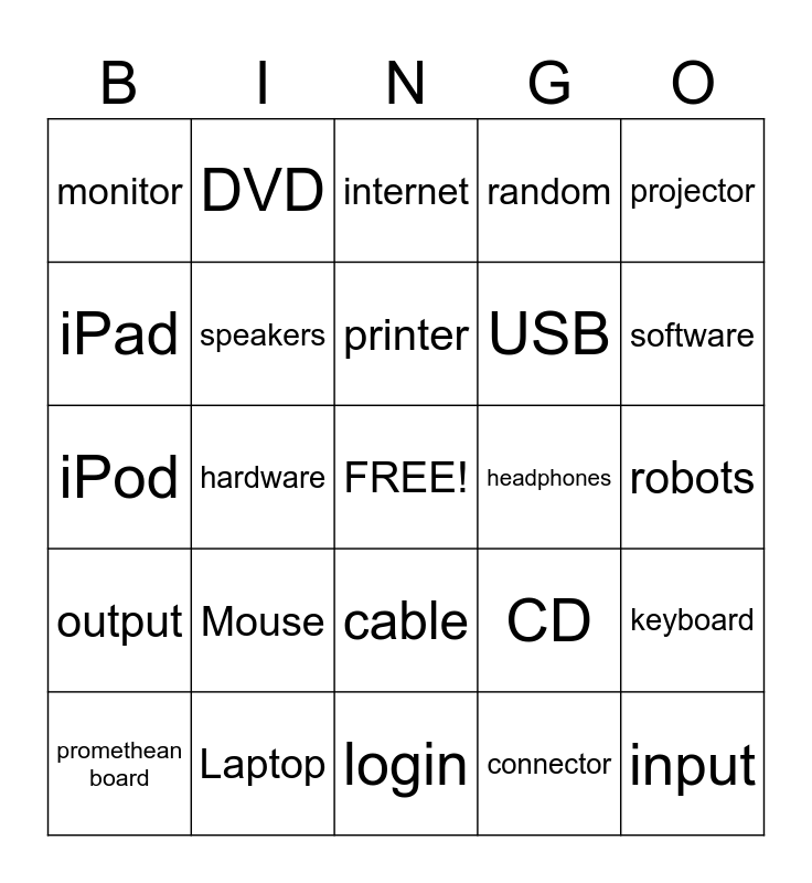 This bingo card has a free space and 24 words: Mouse, Laptop, printer, promethean board, projector, monitor, iPad, DVD, headphones, cable, USB, iPod, CD, keyboard, speakers, connector, robots, internet, software, hardware, input, output, random and login.