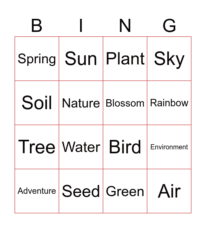 This bingo card has 20 words: Environment, Tree, Plant, Flower, Adventure, Soil, Seed, Spring, Tree, Sun, Water, Bird, Nature, Air, Blossom, Butterfly, Rainbow, Sky, Green and Picnic.