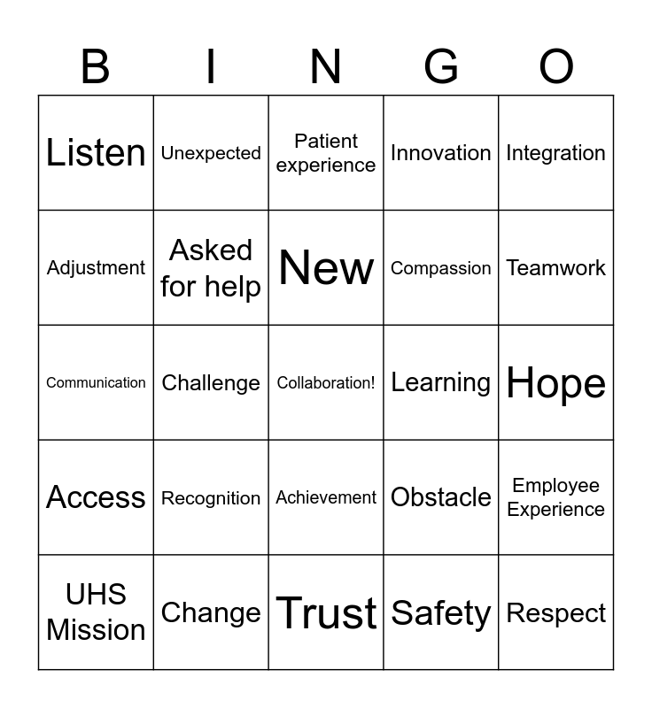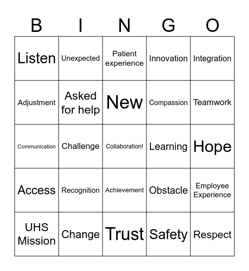 This bingo card has a free space and 24 words: Recognition, Change, New, UHS Mission, Integration, Listen, Adjustment, Unexpected, Learning, Achievement, Compassion, Communication, Obstacle, Employee Experience, Asked for help, Safety, Hope, Patient experience, Teamwork, Challenge, Respect, Access, Innovation and Trust.