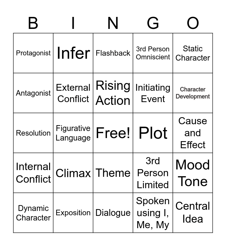This bingo card has a free space and 24 words: Climax, Exposition, Rising Action, Dynamic Character, Static Character, Protagonist, Antagonist, Infer, Plot, Theme, Initiating Event, Resolution, 3rd Person Limited, Mood Tone, External Conflict, Spoken using I, Me, My, Cause and Effect, Flashback, Character Development, Figurative Language, Central Idea, Internal Conflict, 3rd Person Omniscient and Dialogue.