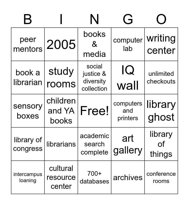 This bingo card has a free space and 39 words: Can name one library database, floyd county library collection, interlibrary loan, study rooms, intercampus loaning, academic search complete, social justice & diversity collection, IUCAT - library catalog, writing center, library of congress, children and YA books, computer lab, conference rooms, library ghost, computers and printers, librarians, service desk, peer mentors, research skills, art gallery, book a librarian, 700+ databases, IQ wall, unlimited checkouts, flags around the world, quiet study floor, stacks, subway, comics & graphic novels, 2005, information literacy, scholarly journals, books & media, cultural resource center, archives, dvds, library of things, sensory boxes and library card.