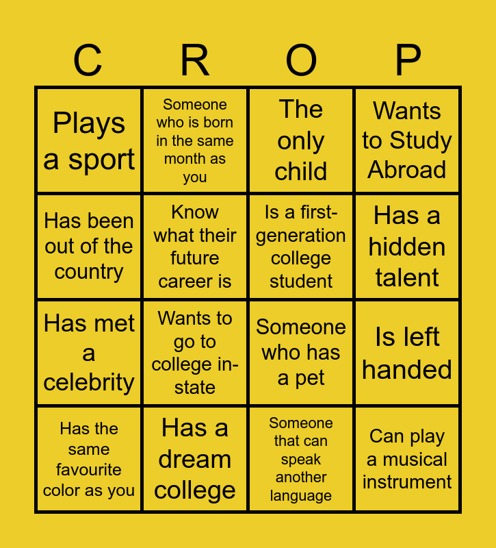 This bingo card has 16 words: Has a dream college, Is left handed, The only child, Plays a sport, Has met a celebrity, Someone who is born in the same month as you, Someone who has a pet, Someone that can speak another language, Has been out of the country, Know what their future career is, Has the same favourite color as you, Wants to Study Abroad, Wants to go to college in-state, Has a hidden talent, Is a first-generation college student and Can play a musical instrument.