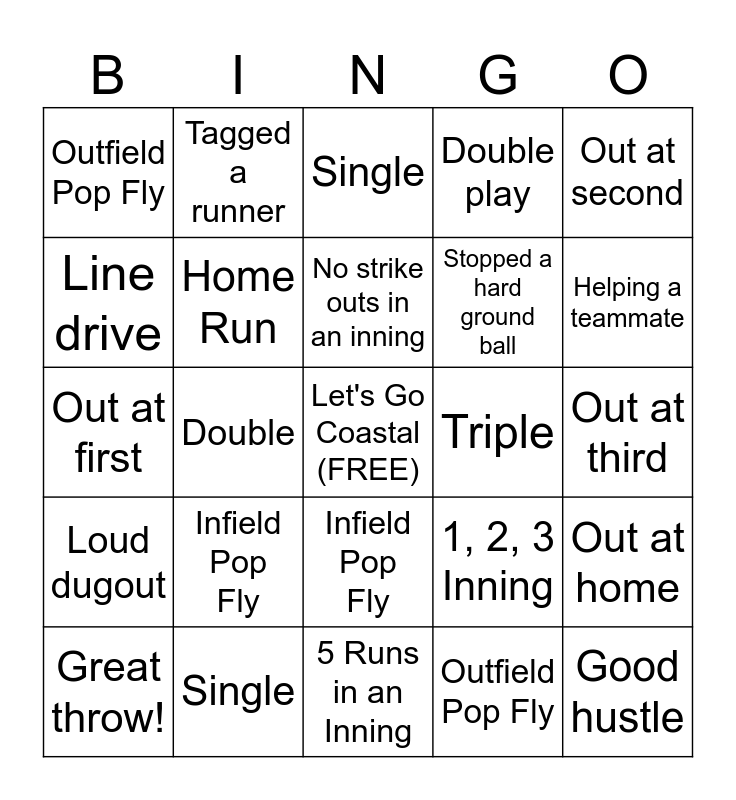 This bingo card has a free space and 24 words: Infield Pop Fly, Single, No strike outs in an inning, Great throw!, Out at second, Outfield Pop Fly, Line drive, Tagged a runner, Triple, Infield Pop Fly, Stopped a hard ground ball, Out at first, 1, 2, 3 Inning, Out at home, Home Run, Outfield Pop Fly, Out at third, Single, Helping a teammate, Double, Good hustle, Loud dugout, Double play and 5 Runs in an Inning.