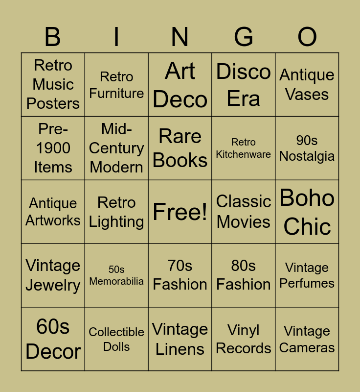 This bingo card has a free space and 25 words: 50s Memorabilia, Vintage Linens, Rare Books, 60s Decor, Antique Vases, Retro Music Posters, Pre-1900 Items, Retro Furniture, Classic Movies, 70s Fashion, Retro Kitchenware, Antique Artworks, 80s Fashion, Vintage Perfumes, Mid-Century Modern, Old School Technology, Boho Chic, Art Deco, 90s Nostalgia, Retro Lighting, Vintage Cameras, Collectible Dolls, Vintage Jewelry, Disco Era and Vinyl Records.