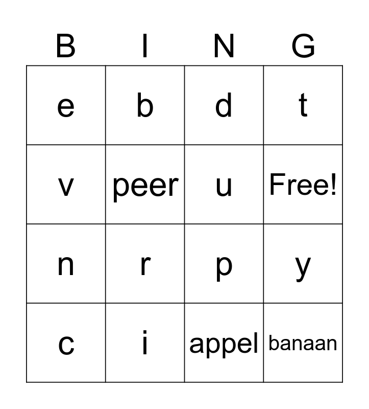 This bingo card has 17 words: appel, c, d, e, r, t, y, u, Free!, peer, i, p, v, b, n, m and banaan.