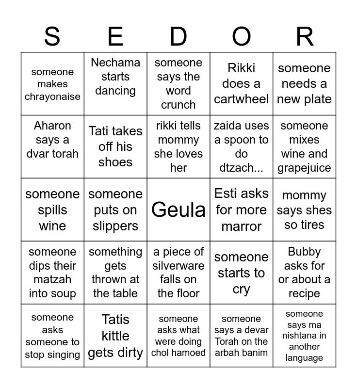 This bingo card has a free space and 27 words: someone starts to cry, someone cant stop laughing, zaida uses a spoon to do dtzach..., someone asks what were doing chol hamoed, Aharon says a dvar torah, someone says the word crunch, Nechama starts dancing, someone dips their matzah into soup, Esti asks for more marror, Bubby asks for or about a recipe, someone spills wine, Rikki does a cartwheel, someone asks someone to stop singing, Tatis kittle gets dirty, someone mixes wine and grapejuice, Aharon takes off his tie and hat, Tati takes off his shoes, rikki tells mommy she loves her, something gets thrown at the table, someone makes chrayonaise, mommy says shes so tires, someone says a devar Torah on the arbah banim, someone puts on slippers, someone says ma nishtana in another language, a piece of silverware falls on the floor, someone needs a new plate and someone gives someone else a special compliment.