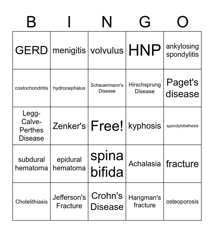 This bingo card has a free space and 24 words: epidural hematoma, Jefferson's Fracture, Scheuermann's Disease, Cholelithiasis, ankylosing spondylitis, GERD, costochondritis, menigitis, kyphosis, spina bifida, Hirschsprung Disease, Legg-Calve-Perthes Disease, Achalasia, fracture, hydrocephalus, Hangman's fracture, spondylolisthesis, volvulus, Paget's disease, Zenker's, osteoporosis, subdural hematoma, HNP and Crohn's Disease.