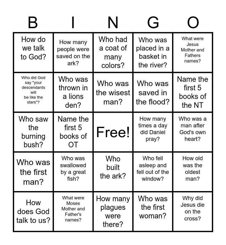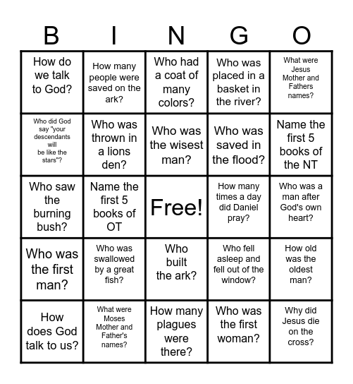 This bingo card has a free space and 24 words: Who was swallowed by a great fish?, What were Moses Mother and Father's names?, Who was the wisest man?, How does God talk to us?, What were Jesus Mother and Fathers names?, How do we talk to God?, Who did God say "your descendants will be like the stars"?, How many people were saved on the ark?, How many times a day did Daniel pray?, Who built the ark?, Who was saved in the flood?, Who saw the burning bush?, Who fell asleep and fell out of the window?, How old was the oldest man?, Who was thrown in a lions den?, Who was the first woman?, Who was a man after God's own heart?, Who had a coat of many colors?, Name the first 5 books of the NT, Name the first 5 books of OT, Why did Jesus die on the cross?, Who was the first man?, Who was placed in a basket in the river? and How many plagues were there?.
