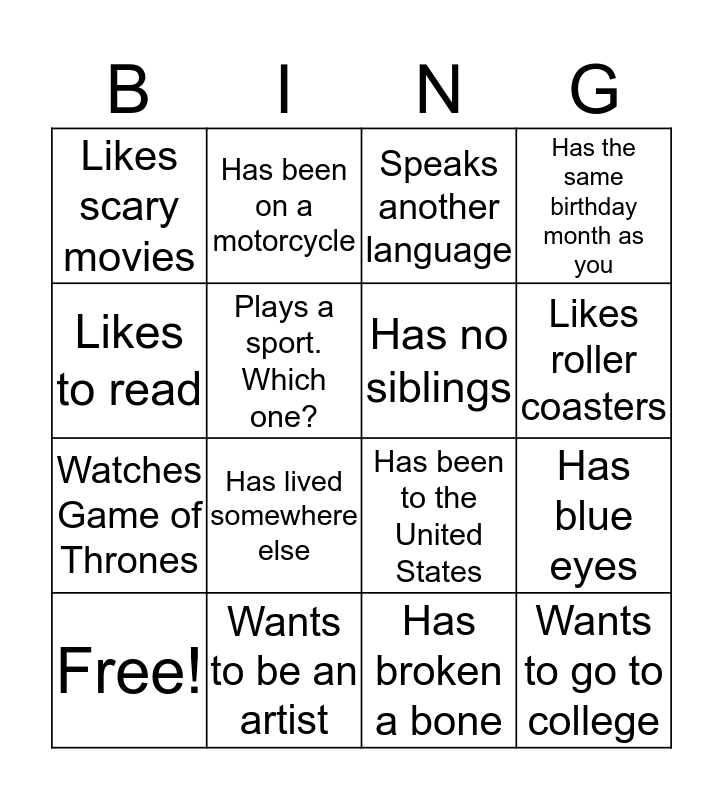 This bingo card has a free space and 15 words: Free!, Wants to go to college, Speaks another language, Likes scary movies, Likes roller coasters, Likes to read, Has lived somewhere else, Has broken a bone, Plays a sport. Which one?, Watches Game of Thrones, Has blue eyes, Has the same birthday month as you, Has no siblings, Has been on a motorcycle and Wants to be an artist.
