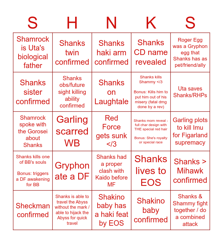 This bingo card has 25 words: Gryphon ate a DF, Shakino baby has a haki feat by EOS, Shanks on Laughtale, Sheckman confirmed, Roger Egg was a Gryphon egg that Shanks has as pet/friend/ally, Shamrock is Uta's biological father, Shanks sister confirmed, Shanks twin confirmed, Shanks mom reveal - full char design with THE special red hair Bonus: She's royalty or special race, Shanks had a proper clash with Kaido before MF, Shanks kills Shammy </3 Bonus: Kills him to put him out of his misery (fatal dmg done by a rev), Shamrock spoke with the Gorosei about Shanks, Shanks lives to EOS, Shanks > Mihawk confirmed, Shanks obs/future sight killing ability confirmed, Shanks & Shammy fight together / do a combined attack, Garling plots to kill Imu for Figarland supremacy, Shanks haki arm confirmed, Uta saves Shanks/RHPs, Garling scarred WB, Red Force gets sunk </3, Shanks is able to travel the Abyss without the mark / able to hijack the Abyss for quick travel, Shanks kills one of BB's souls Bonus: triggers a DF awakening for BB, Shanks CD name revealed and Shakino baby confirmed.