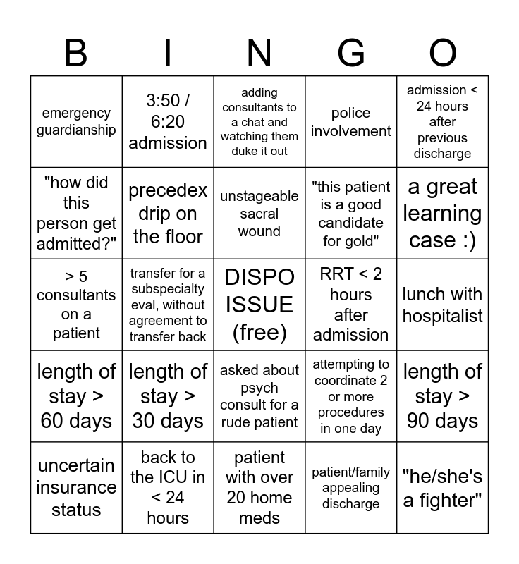 This bingo card has a free space and 24 words: length of stay > 30 days, back to the ICU in < 24 hours, unstageable sacral wound, uncertain insurance status, admission < 24 hours after previous discharge, emergency guardianship, "how did this person get admitted?", 3:50 / 6:20 admission, RRT < 2 hours after admission, asked about psych consult for a rude patient, "this patient is a good candidate for gold", > 5 consultants on a patient, attempting to coordinate 2 or more procedures in one day, length of stay > 90 days, precedex drip on the floor, patient/family appealing discharge, lunch with hospitalist, adding consultants to a chat and watching them duke it out, a great learning case :), transfer for a subspecialty eval, without agreement to transfer back, "he/she's a fighter", length of stay > 60 days, police involvement and patient with over 20 home meds.