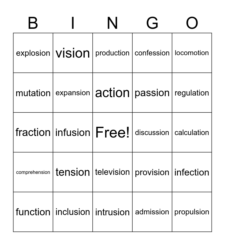 This bingo card has a free space and 24 words: tension, inclusion, action, function, locomotion, explosion, mutation, vision, discussion, television, passion, fraction, provision, infection, expansion, admission, calculation, production, regulation, infusion, propulsion, comprehension, confession and intrusion.