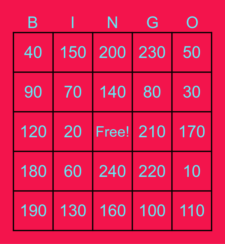 This bingo card has a free space and 24 words: 60, 130, 140, 190, 50, 40, 90, 150, 210, 240, 80, 120, 220, 10, 70, 100, 170, 200, 30, 20, 110, 180, 230 and 160.