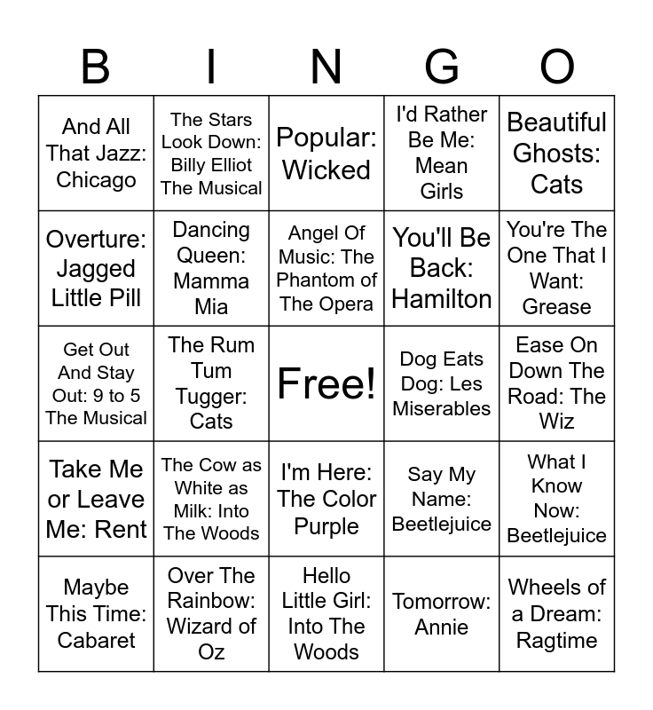 This bingo card has a free space and 52 words: I'm an Ordinary Man: My Fair Lady, Wheels of a Dream: Ragtime, There's No Business Like Show Business: There's No Business Like Show Business, Hello Little Girl: Into The Woods, The Cow as White as Milk: Into The Woods, Welcome To The Rock: Come From Away, The Stars Look Down: Billy Elliot The Musical, I Whistle A Happy Tune: The King and I, Overture: Jagged Little Pill, Mamma Mia: Mamma Mia, Dancing Queen: Mamma Mia, Dead Girl Walking: Heathers The Musical, What I Know Now: Beetlejuice, Say My Name: Beetlejuice, Day-O: Beetlejuice, The Phantom of The Opera: The Phantom of The Opera, Angel Of Music: The Phantom of The Opera, Dog Eats Dog: Les Miserables, Work Song: Les Miserables, Beautiful Ghosts: Cats, The Rum Tum Tugger: Cats, Tomorrow: Annie, And All That Jazz: Chicago, You'll Be Back: Hamilton, Seasons of Love: Rent, Suddenly Seymour: Little Shop Of Horrors, Hello!: The Book of Mormon, Good Morning Baltimore: Hairspray, You're The One That I Want: Grease, Burn: Hamilton, Way Down Hadestown: Hadestown, I'd Rather Be Me: Mean Girls, Apex Predator: Mean Girls, You Can't Stop the Beat: Hairspray, Defying Gravity: Wicked, Popular: Wicked, Over The Rainbow: Wizard of Oz, Poor Thing: Sweeney Todd, This Is Me: The Greatest Showman, The Worst Pies in London: Sweeney Todd, Don't Rain On My Parade: Funny Girl, Ease On Down The Road: The Wiz, Take Me or Leave Me: Rent, Circle of Life: The Lion King, I'm Here: The Color Purple, Kiss Of The Spider Woman: Kiss Of The Spider Woman, When I Grow Up: Matilda, Get Out And Stay Out: 9 to 5 The Musical, My Favorite Things: The Sound Of Music, Cell Block Tango: Chicago, Maybe This Time: Cabaret and On The Street Where You Live: My Fair Lady.