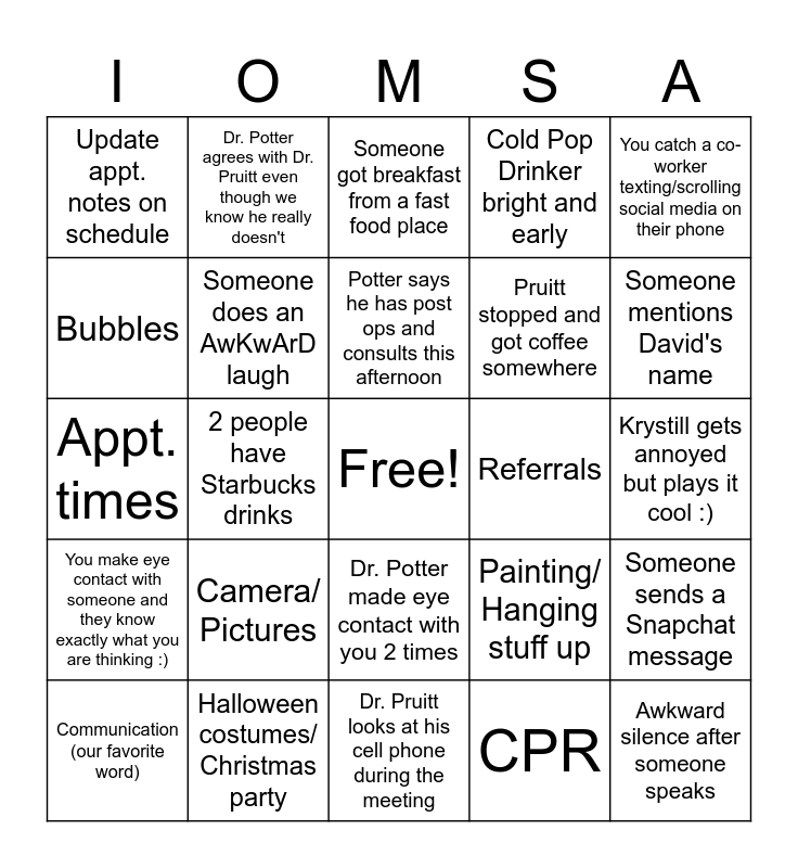 This bingo card has a free space and 24 words: Camera/ Pictures, Halloween costumes/ Christmas party, Potter says he has post ops and consults this afternoon, Communication (our favorite word), You catch a co-worker texting/scrolling social media on their phone, Update appt. notes on schedule, Bubbles, Dr. Potter agrees with Dr. Pruitt even though we know he really doesn't, Referrals, Dr. Potter made eye contact with you 2 times, Pruitt stopped and got coffee somewhere, Appt. times, Painting/ Hanging stuff up, Someone sends a Snapchat message, Someone does an AwKwArD laugh, CPR, Krystill gets annoyed but plays it cool :), Someone got breakfast from a fast food place, Someone mentions David's name, 2 people have Starbucks drinks, Awkward silence after someone speaks, You make eye contact with someone and they know exactly what you are thinking :), Cold Pop Drinker bright and early and Dr. Pruitt looks at his cell phone during the meeting.
