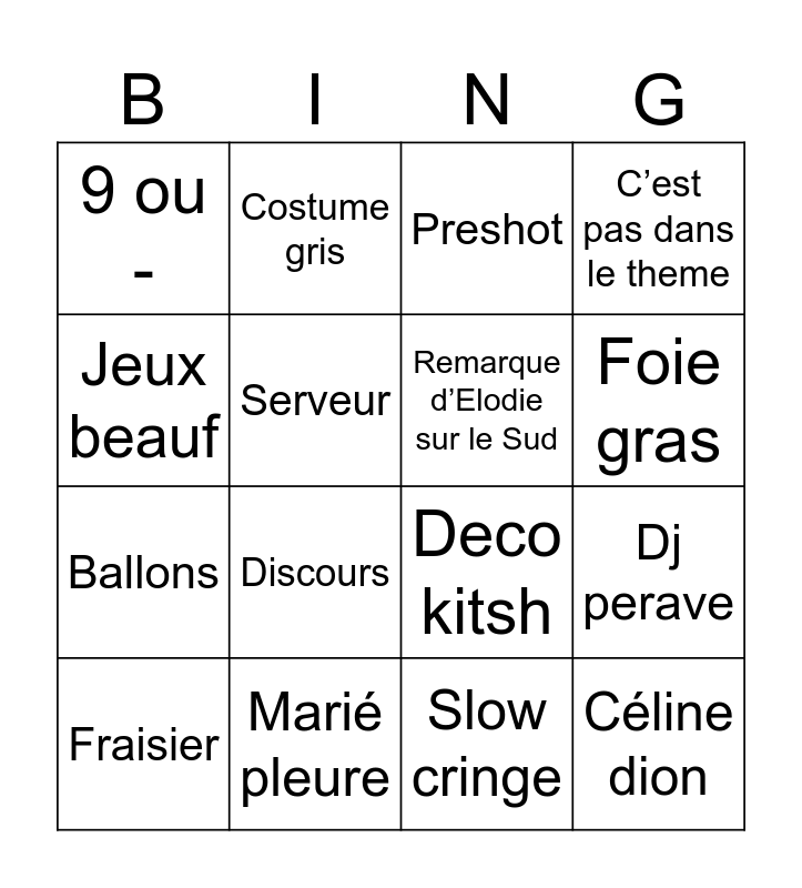 This bingo card has 16 words: Marié pleure, Dj perave, Preshot, 9 ou -, Ballons, Costume gris, Deco kitsh, Slow cringe, Jeux beauf, Serveur, Fraisier, C’est pas dans le theme, Discours, Foie gras, Remarque d’Elodie sur le Sud and Céline dion.