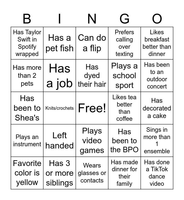 This bingo card has a free space and 24 words: Left handed, Has 3 or more siblings, Has dyed their hair, Favorite color is yellow, Likes breakfast better than dinner, Has Taylor Swift in Spotify wrapped, Has more than 2 pets, Has a pet fish, Likes tea better than coffee, Plays video games, Plays a school sport, Has been to Shea's, Has been to the BPO, Sings in more than 1 ensemble, Has a job, Has made dinner for their family, Has decorated a cake, Can do a flip, Has been to an outdoor concert, Knits/crochets, Has done a TikTok dance video, Plays an instrument, Prefers calling over texting and Wears glasses or contacts.