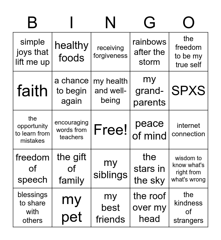 This bingo card has a free space and 24 words: the gift of family, my pet, my health and well-being, blessings to share with others, the freedom to be my true self, simple joys that lift me up, faith, healthy foods, peace of mind, my siblings, my grand-parents, the opportunity to learn from mistakes, the stars in the sky, wisdom to know what's right from what's wrong, a chance to begin again, the roof over my head, internet connection, receiving forgiveness, SPXS, encouraging words from teachers, the kindness of strangers, freedom of speech, rainbows after the storm and my best friends.