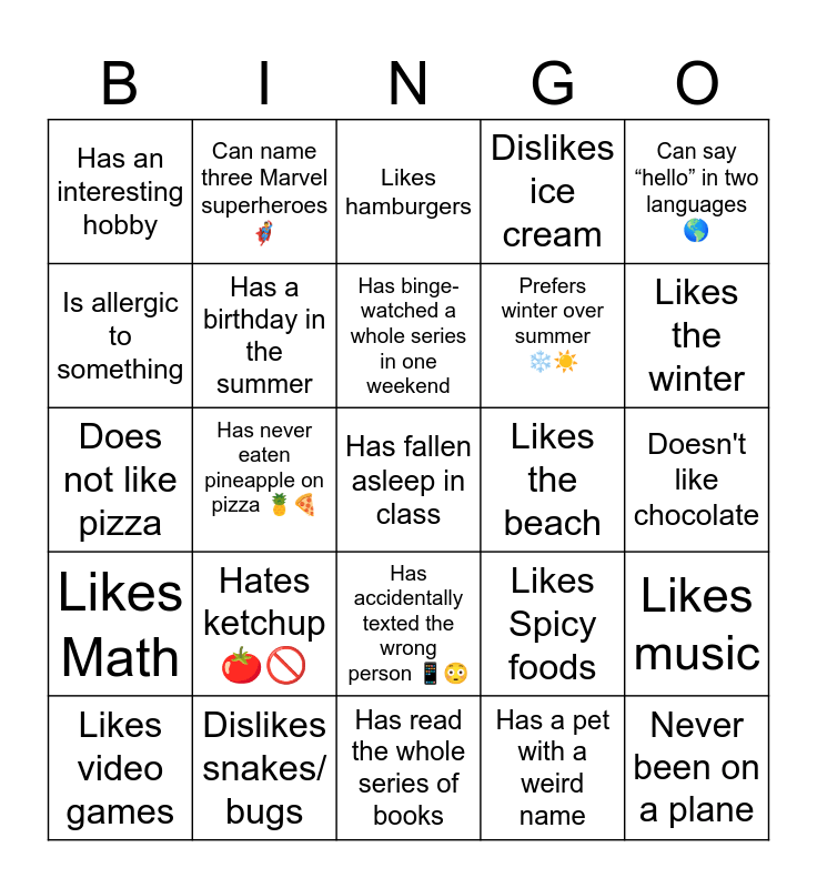 This bingo card has a free space and 34 words: Likes scary movies, Has a pet with a weird name, Likes Cheese, Has siblings, Likes Math, Has a birthday in the summer, Can say βhelloβ in two languages π, Likes video games, Can name three Marvel superheroes π¦ΈββοΈ, Likes Science, Has binge-watched a whole series in one weekend, Likes hamburgers, Is a middle child, Wants to go to college, Likes the beach, Likes the winter, Dislikes snakes/ bugs, Does not like pizza, Hates ketchup π π«, Likes Spicy foods, Has accidentally texted the wrong person π±π³, Likes to camp, Has an interesting hobby, Doesn't like chocolate, Has read the whole series of books, Never been on a plane, Dislikes ice cream, Can speak a different language, Prefers winter over summer βοΈβοΈ, Is allergic to something, Has broken a bone, Has never eaten pineapple on pizza ππ, Likes music and Does not have a cell phone.